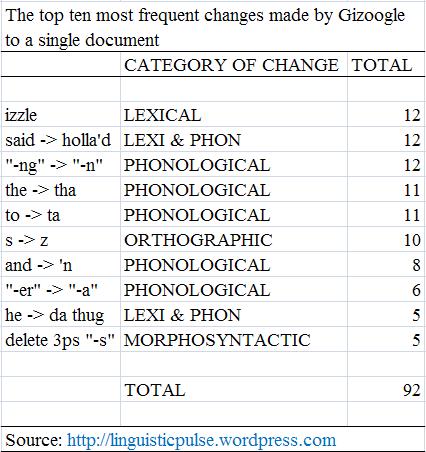 There were 54 different types of changes. 23 of these fit into multiple categories. In particular, 22 involved both lexical changes and phonological changes. For example, Gizoogle changed “using” to “rockin”. The lexical change involved using the verb “to rock” instead of “to use”. The phonological change involved changing “-ing” to “-in”, which is a slightly different yet very common pronunciation (more on this below).