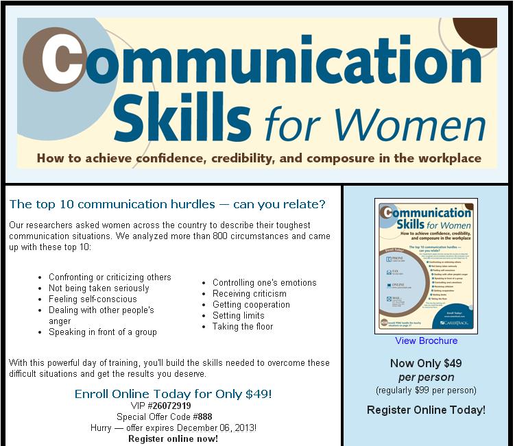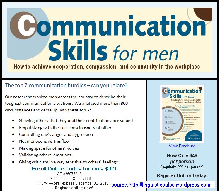 I think this point is best driven home by a creative alternative reality in which men are expected to learn ‘communication skills’ to ‘be successful’ in a world dominated by the type of communication women might prefer. In such a reality the flyer below is what I would have received in my inbox.