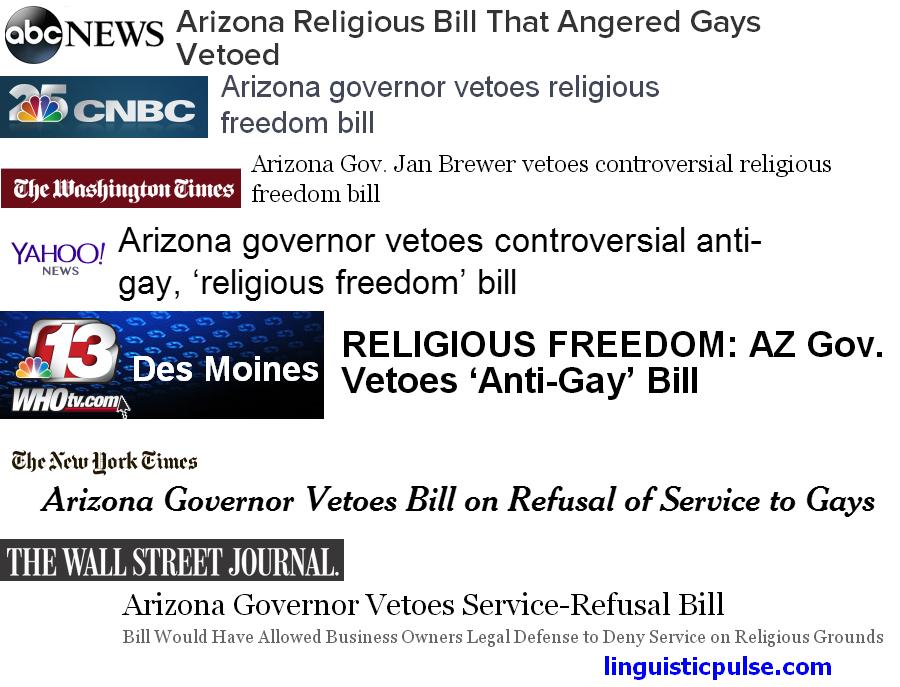 In the past couple of months, this threat has been elaborated on by numerous state legislatures who have introduced bills claiming to protect the “religious liberty” or “religious freedom” of citizens in the state. Indeed, as I am writing the news has just come in that Arizona governor Jane Brewer has vetoed a bill that passed in that state’s legislature. The myriad headlines provide some indication of the way that this bill has been reported on in the media and demonstrates that the phrases “religious freedom” or “religious liberty” and the ideology that supports them are not wholly accepted (or for that matter wholly dismissed) by various media outlets. Note in the image below the presence of scare quotes around religious freedom for some outlets but not others. Also note the presence or absence or mention of homosexuals, including Yahoo! News‘ characterization of the bill as anti-gay and one NBC channel’s reflection of this accusation using scare quotes.