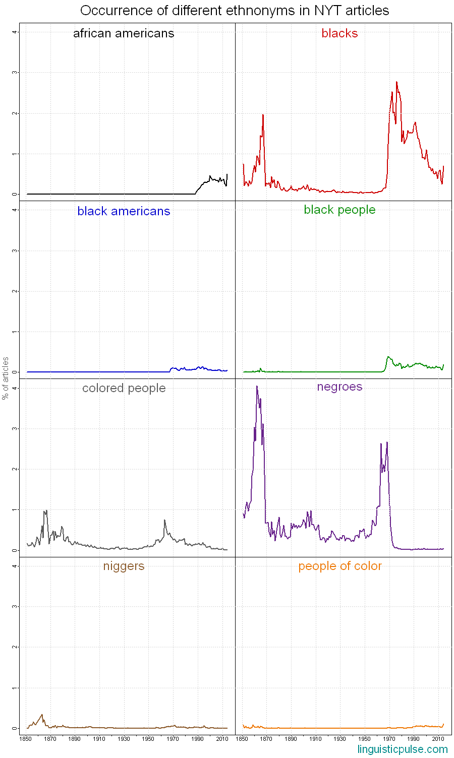 It was not until the 1990s that the paper began to use the word African Americans. Today, NYT writers use that term as well as blacks, black people, and people of color. The terms preferred in the early years of the Civil Rights Movement, colored people and negroes, have all but disappeared from NYT writing.